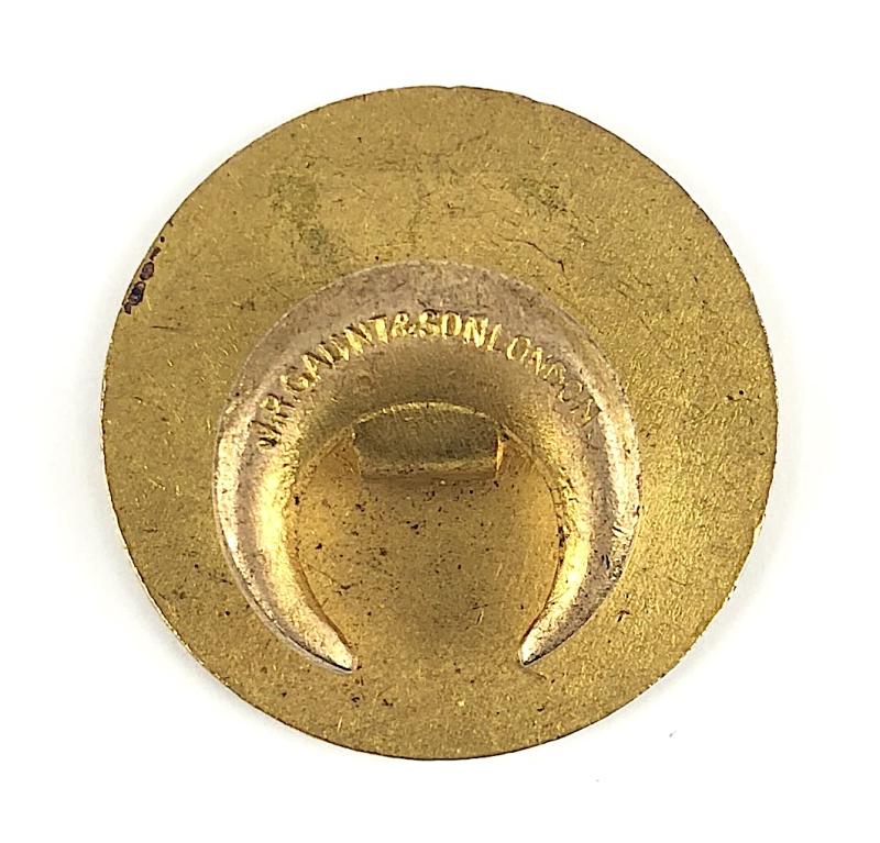 A scarce original First World War period 'The British Leather Co. Ltd On War Supplies 1915 identification badge', large gilt blue enamel title surround, the companies embossed logo to centre; the reverse impressed with maker's details 'J.R.GAUNT & SONS LONDON'. Very good condition, complete with original buttonhole fitting, enamel with small niick in the 4 o'clock position, gilt finish remains bright.