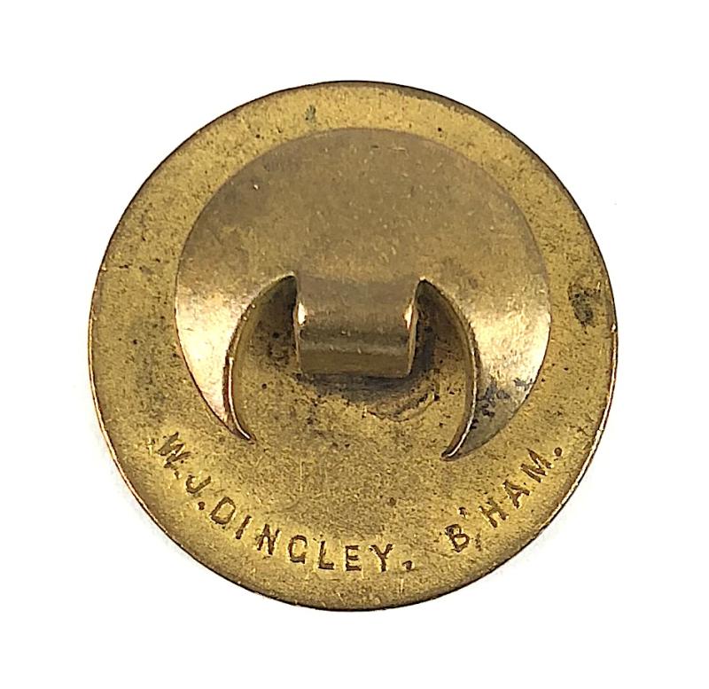 A good original First World War period circular gilt badge with central Crown and title surround 'On War Service 1914' inlaid with dark blue enamel, the reverse impressed with scarce maker's details 'W.J.DINGLEY B'HAM'. Very good condition, complete with original buttonhole fitting, no damage to the enamel.