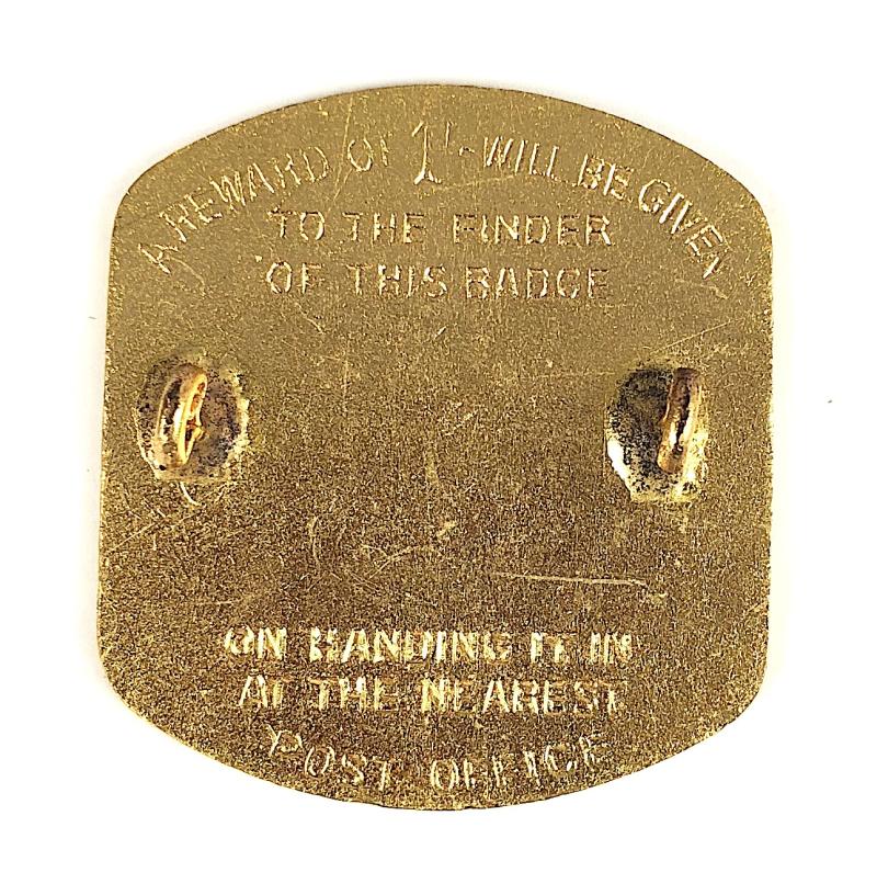 A good original circa 1958 to 1969 vintage period 'General Post Office postmans security breast badge'; large brass example, wide black enamel band top and bottom, inscribed 'GPO' postmans identification number '155' and area code 'YH'; the reverse impressed 'Reward of 1/- Will Be Given To The Finder Of This Badge On Handing It In At The Nearest Post Office'. Very good condition, no enamel loss, complete with original two loop fittings and split pin.