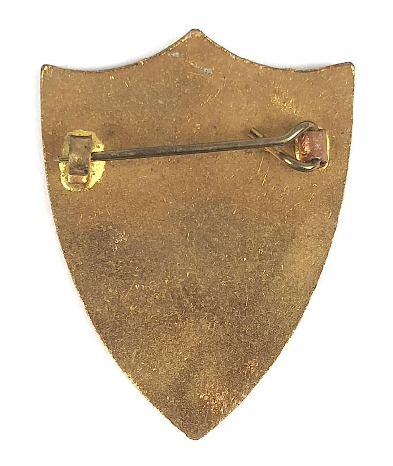 A good original circa pre-1958 'Warners Holiday Camp Dovercourt Bay gilt and enamel badge', in the form of a large shield depicting a panoramic view of the club house building flying a flag. Very good condition, complete with original pin fittings, no stress marks or damage to enamel, gilt finish remains bright.