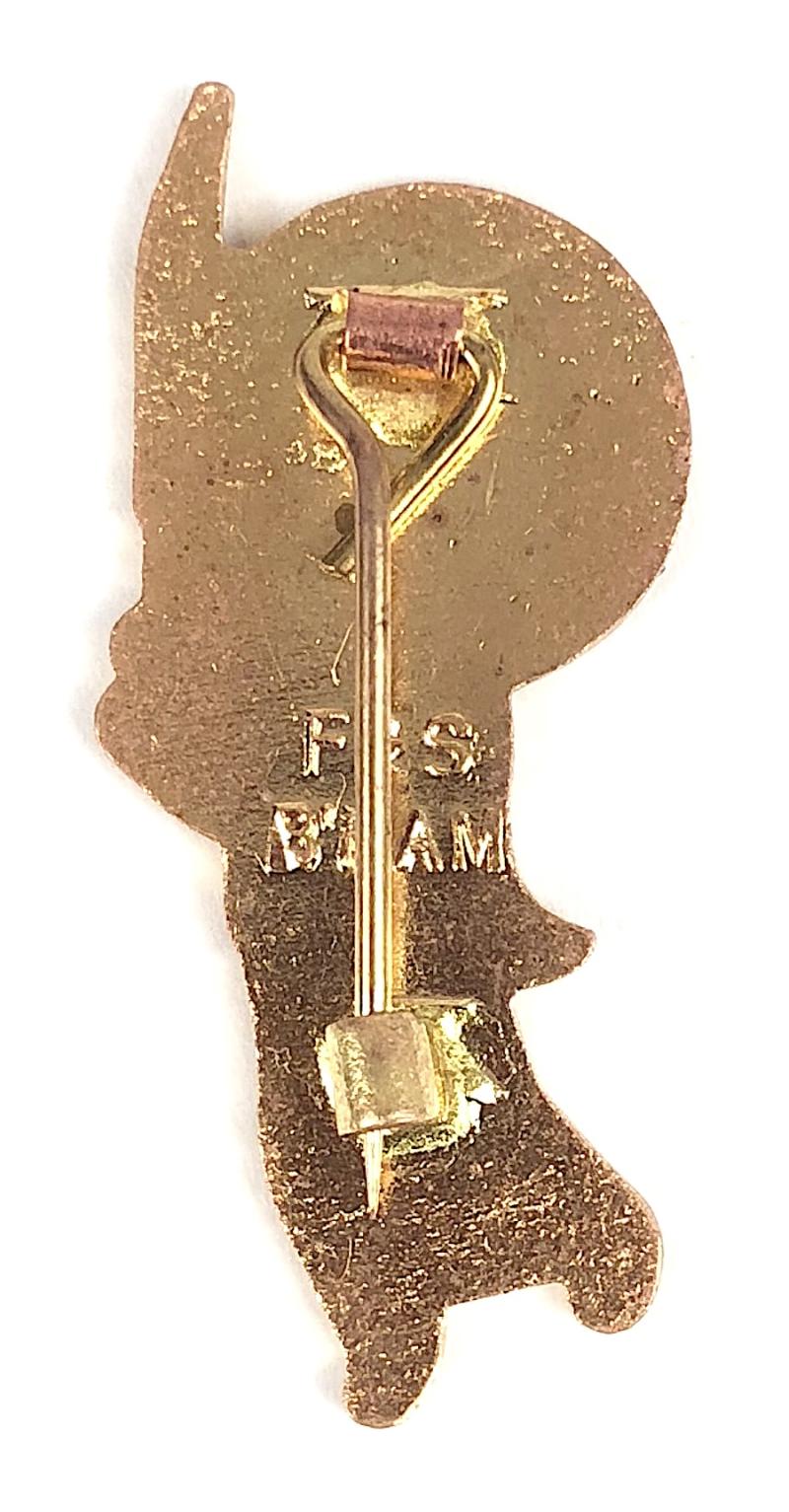 A good original circa 1950's period 'Robertson's Golly cricketer Marmalades and Jams, promotional badge', wearing a white waistcoat, dark blue coat and displaying the advertising slogan 'Golden Shred', the reverse impressed with large horizintal maker's details 'F&S B'HAM' (Fattorini & Sons, Birmingham). Very good condition, complete with original pin fittings, no stress marks or damage to the enamel, gilt finish remains bright, an excellent example.