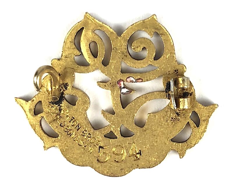 A rare original Victorian period undated 'Lingfield Park Racecourse ladies pin badge'; ornate gilt example inlaid with red and white enamel Lingfield Park monogram to centre; the reverse impressed with maker's details 'Crighton Bros 22 Old Bond St. W' and official issue number '594'. Very good condition, complete with original pin fittings, actual PIN NOW ABSENT no defects to the enamel, gilt finish remains bright.